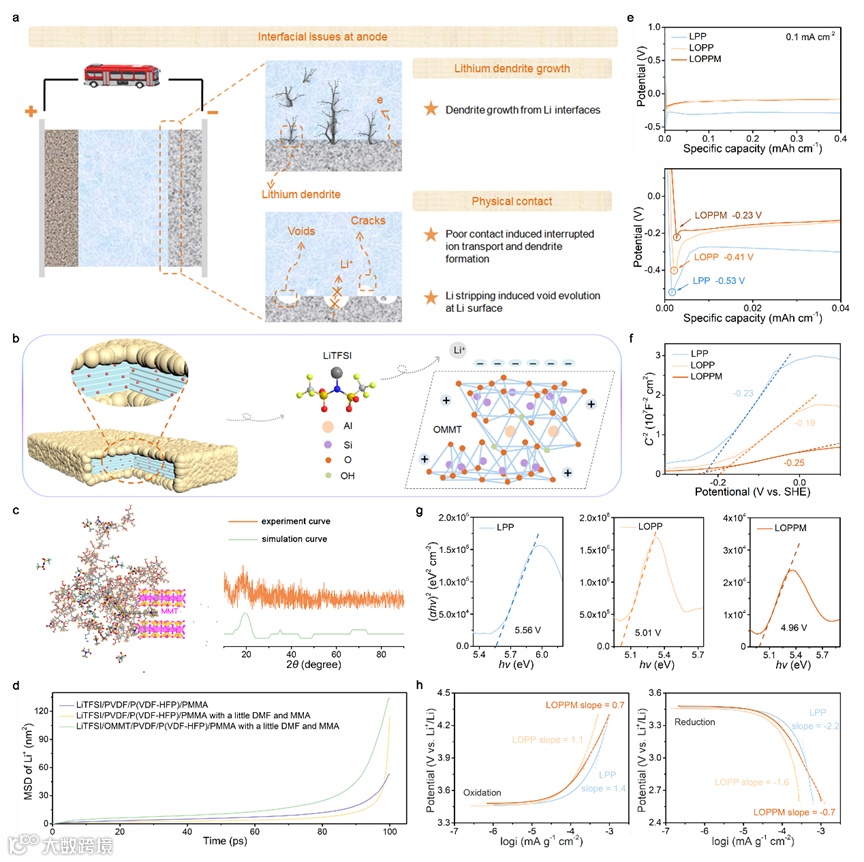 图1. a) 锂离子电池中界面问题示意图。b) OMMT促进锂离子迁移示意图。c) LOPPM 聚合物电解质的MD模拟模型和XRD曲线。d) MD模拟Li+的均方位移(MSD)。e) 0.1 mA cm−2电流密度下,不同聚合物电解质电池成核阶段的电压-时间曲线。f) LOPPM、LOPP、LPP聚合物电解质的Mott-Schottky曲线。g)三种聚合物电解质的带隙。h)氧化和还原的Tafel斜率。