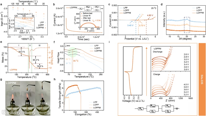 图3. a)温度对离子电导率的影响。b) LOPPM 聚合物电解质极化前后的计时电流曲线,以及极化前后的交流阻抗谱。c)线性扫描伏安法d) LOPPM、LOPP和LPP聚合物电解质的XRD谱图。e) LOPPM聚合物电解质的TG/DTG图。f) LOPPM、LOPP和LPP聚合物电解质的DSC图。g) LOPPM聚合物电解质燃烧试验。h)拉伸强度曲线。i) LOPPM聚合物电解质的原位EIS。