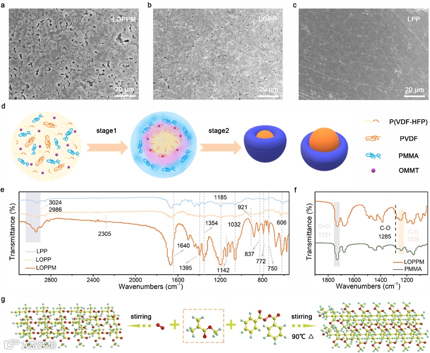 图2. a) LOPPM, b) LOPP, c) LPP PEs表面的SEM图像。d) 聚合物电解质多孔形态形成示意图。e) LOPPM、LOPP和LPP 聚合物电解质的FT-IR图。f) LOPPM和PMMA的FT-IR图。g) MMA与O2及BPO反应聚合的模型。