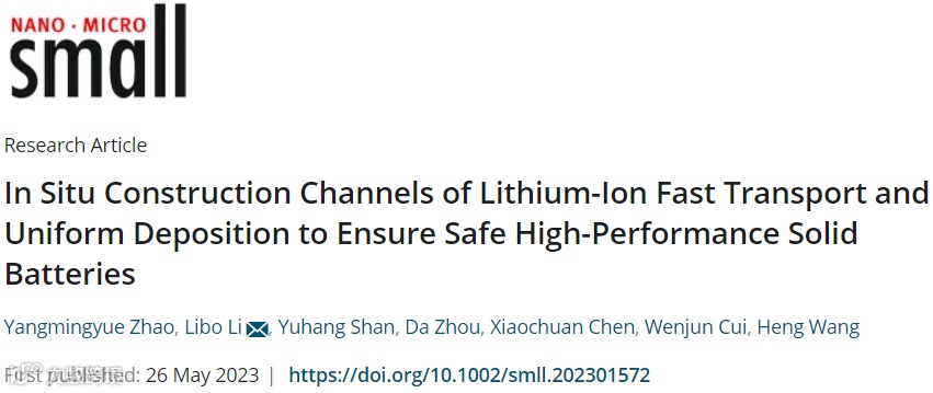 近日,哈尔滨理工大学的李丽波教授课题组,在国际知名期刊Small上发表题为“In Situ Construction Channels of Lithium-Ion Fast Transport and Uniform Deposition to Ensure Safe High-Performance Solid Batteries”的研究论文。该研究基于甲基丙烯酸甲酯原位聚合,制备了具有三维离子通道的聚合物电解质。在聚合物电解质中引入有机改性蒙脱土可以提高锂离子解离及迁移能力,使聚合物电解质达到1.1 × 10−3 S cm−1的高离子电导率和0.54的锂离子转移数。聚合物电解质与锂负极形成的稳定SEI膜有效降低了电池的界面极化,诱导锂离子均匀球形沉积。在室温下0.5 C循环100次后,电池的容量保持率仍为100%,聚合物电解质重复利用后的初始容量仍高达123.9 mAh g−1。这项工作为开发高性能和可重复使用的锂离子电池提供了一条可行的途径。