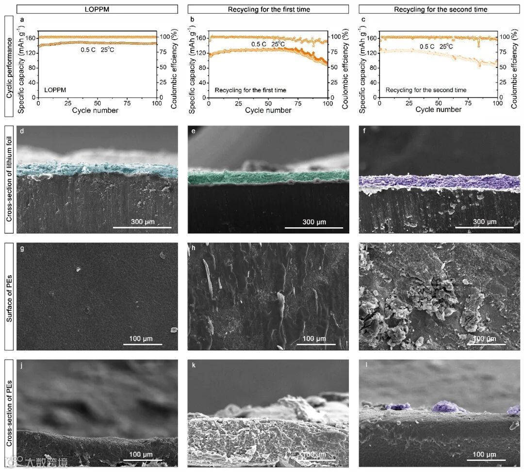 图5.含LOPPM聚合物电解质的锂离子电池在0.5 C和室温下的充放电曲线a)新鲜LOPPM 聚合物电解质, b) LOPPM 聚合物电解质首次回收,C) LOPPM 聚合物电解质第二次回收。d)新鲜LOPPM 聚合物电解质, e)第一次LOPPM 聚合物电解质回收,f)第二次LOPPM 聚合物电解质回收后的锂箔截面。g)新鲜LOPPM 聚合物电解质的表面,h) LOPPM 聚合物电解质第一次回收,i) LOPPM 聚合物电解质循环后第二次回收。j)新鲜LOPPM 聚合物电解质, k) LOPPM 聚合物电解质第一次回收,l) LOPPM 聚合物电解质循环后第二次回收的截面。