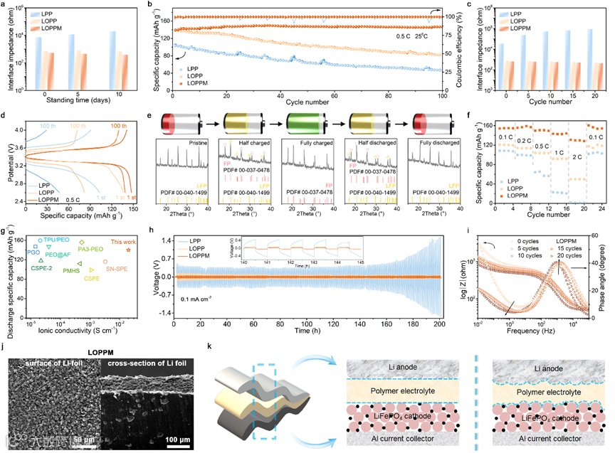 图4. 界面阻抗与a)放置时间和c)循环周期的关系。b)在0.5 C和室温下,LOPPM、LOPP和LPP的锂离子电池的充放电曲线和d)电压-容量曲线。e)正极在原始、半充电、完全充电、半放电和完全放电过程中的XRD图谱。f)聚合物电解质的倍率性能。g) 文献比较。h)电流密度为0.05 mA cm−2时对称电池的恒流极化曲线。i)LOPPM聚合物电解质的EIS Bode谱图。j) LOPPM电池的锂负极表面和截面形貌。k) LOPPM 聚合物电解质内部结构示意图。