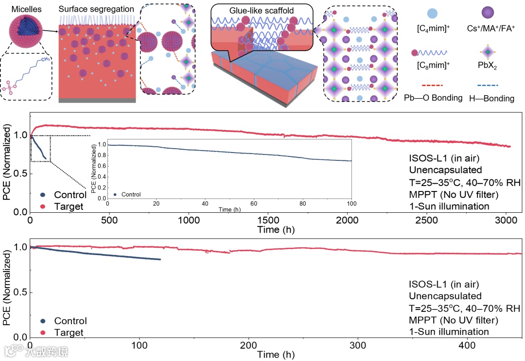 该团队采用一种长碳链阴离子表面活性剂添加剂,研究发现该添加剂能通过表面自分离和胶束化以改善钙钛矿晶体生长动力学,并在钙钛矿晶界构建类胶状的支架以消除残余应力;因此,钙钛矿活性层中缺陷减少、离子迁移受抑制以及能级结构改善。最终实现了未封装的钙钛矿单结和钙钛矿/硅叠层太阳电池在最大功率点跟踪下连续光照下3,000小时和450小时的运行稳定性测试中,分别保持了85.7%和93.6%的初始性能,代表了迄今为止在类似条件下报道的稳定性最佳的器件之一。