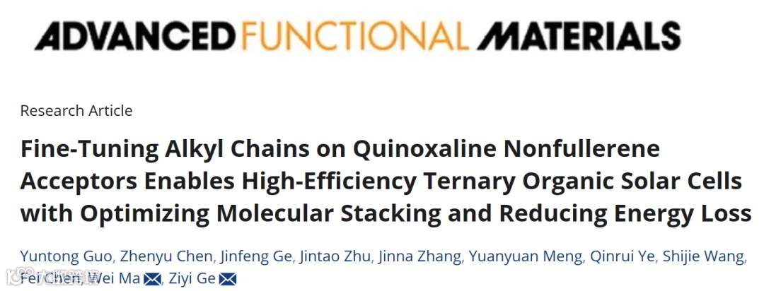 近日,来自中科院宁波材料所的葛子义研究员与西安交通大学的马伟教授合作,在国际知名期刊Adv. Funct. Mater.上发表题为“Fine-tuning alkyl chains on quinoxaline non-fullerene acceptors enables high-efficiency ternary organic solar cells with optimizing molecular stacking and reducing energy loss”的文章。文章研究了喹喔啉非富勒烯受体中心核上的烷氧基链取向不同对分子堆积行为的影响,将其作为客体受体材料能够提高三元有机太阳能电池的效率,减小能量损失。