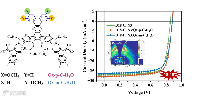 图1. 非富勒烯受体Qx-p-C7H8O和Qx-m-C7H8O分子结构、光伏性能和GIWAXS表征。