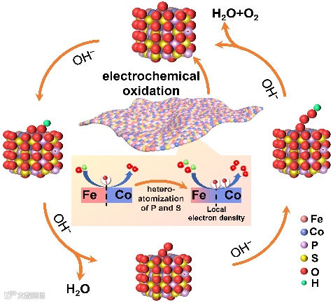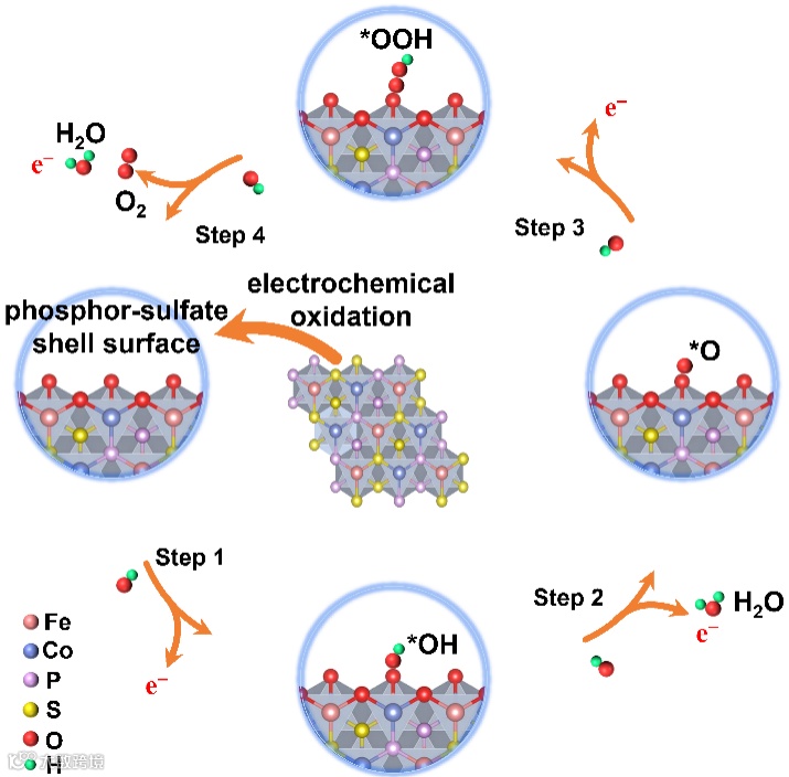 CoFePS四元合金的OER过程发生在磷硫酸盐壳层氧化表面上,遵循吸附剂进化机制的途径如图5所示:包括OH−在磷硫酸盐壳层氧化表面活性位点上的化学吸附(步骤1)、OH−的去质子化(步骤2)和OH−的亲核攻击(步骤3)。然后发生O2分子的解吸(步骤4),释放O2并离开自由表面位置,从另一个水分子的吸附开始下一个循环。