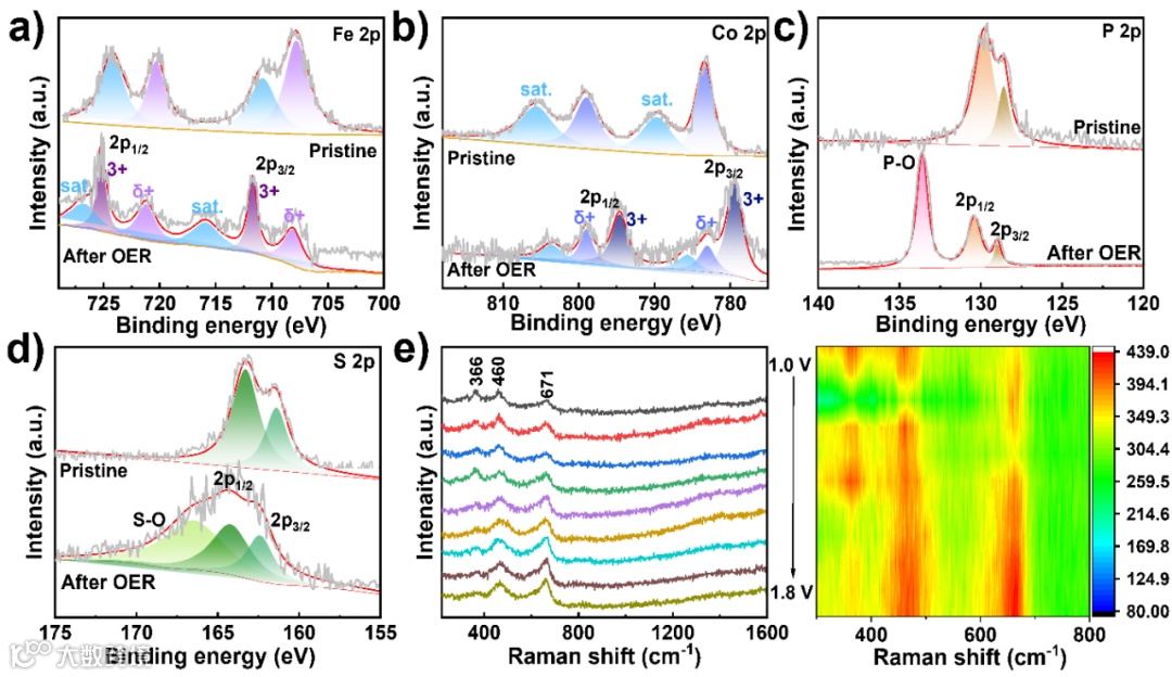 通过XPS光谱以及原位拉曼测试对CoFePS在OER过程中的相结构变化进行了深入探究。催化剂中的金属组分在OER过程中被氧化成更高的价态,比低价态(Coδ+和Feδ+,0<δ<2)提供了更多的3d电子轨道,具有更高的电子接受能力,这利于提升OER过程的电化学活性。OER后,S-O和P-O峰的结合强度相应增加,这与OER过程中磷硫酸盐壳层氧化表面的形成有关,该表面作为OER的活性位点,可以降低反应能垒,最终有效提升OER活性。在不同反应电压下拍摄HR-TEM图像中,可以观察到CoFePS表面出现磷硫酸盐壳层结构。原位拉曼光谱在366、460和671 cm-1处有明显的峰值,分别对应于M-PS、M-O和P-O或S-O。随着电压的进一步增加,M-PS峰值的强度逐渐减弱。相反,M-O和P-O或S-O峰的强度逐渐增加。基于上述分析,随着施加电势的增加,CoFePS四元合金中的部分M-PS转变为磷硫酸盐壳层氧化表面。