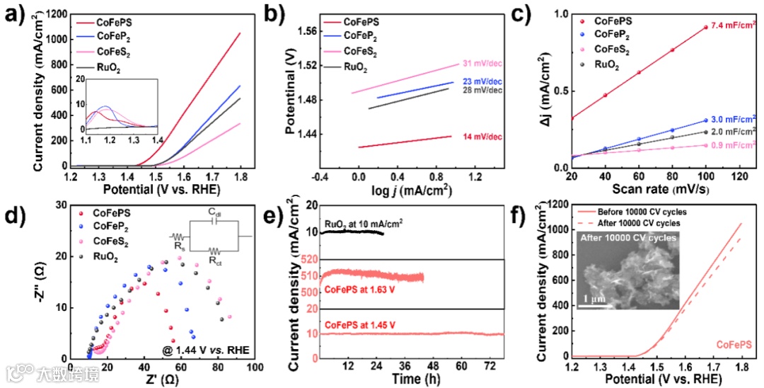 通过不同对比材料的OER性能测试可以看出,CoFePS在仅211 mV的过电位下就获得了10 mA·cm−2的电流密度,且在1.8 V的电压下,其最大电流密度可达1053 mA·cm−2,Tafel斜率仅为14 mV·dec−1;同时,其法拉第效率达到了97%。此外,CoFePS维持较高性能的同时也具有优异的稳定性,在1.45 V下进行计时电流测量78小时后,10 mA·cm−2的初始电流密度保持率为99.7%。即使在1.63 V的电压下,500 mA·cm−2的初始电流密度在测试42小时后,保持率仍在99%左右。优异的OER性能表明CoFePS具有商业水分解应用的潜力。因此,我们将CoFePS作为阳极,用于全解水过程。当过电位为1.48和1.80 V时,可以分别获得10和702 mA·cm−2的电流密度。这完全可以满足商业电解水过程中对催化剂的基本要求(1.8~2.4 V的电压下获得200 ~ 400mA·cm−2的电流密度)。
