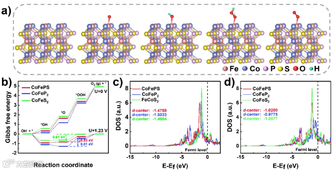 理论计算结果证明了CoFePS可以在较低的外部施加电压下启动OER过程,确定了限速步骤为*OOH的形成过程(*O+OH-→ *OOH+e-),且在该步需要克服的反应能垒最小。态密度分析进一步表明,合金化的CoFePS中的电子结构得到优化,增强了电子转移能力,并使得活性位点对反应中间体的吸附能力更适中,从而展现出优异的OER性能。