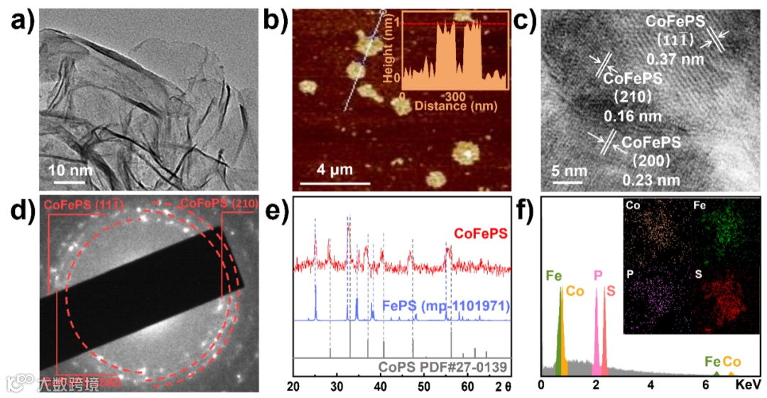 图1的TEM和AFM照片表明,CoFePS四元合金表现为二维片状结构,其厚度仅为0.85 nm左右。通过对比不同金属比例的XRD衍射图谱,可以发现CoFePS的晶格间距及晶面信息明显有别于CoPS或FePS,且Co、Fe、P和S元素以1: 1: 1: 1的原子比均匀分散在亚纳米片的整个结构中。