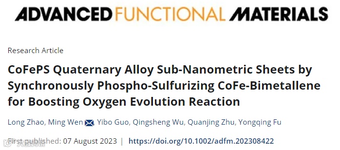 电催化水解产氢是获得可持续高纯度清洁能源氢气的有效途径之一。然而,水解过程中析氧反应(OER)因较高的反应能垒和复杂的电子转移过程往往表现出缓慢的动力学,同时OER活性较高的贵金属催化剂使得商业电解水成本居高不下。近年来,具有高活性低成本的过渡金属OER电催化剂成为能源领域和电化学研究的前沿和热点。二维亚纳米超薄结构能在有效增加电解质与催化剂接触表面积的同时获得活性位点的充分暴露。同济大学温鸣教授课题组通过对双贱金属烯的同步硫磷化,获得了亚纳米厚度超薄结构的CoFePS四元合金。由于P和S能协同调节相邻金属原子的费米能级,降低反应能垒,同时提升导电性,在OER过程中,1.8 V的电压下获得了1053 mA·cm−2的大电流密度,能完全满足商业电解水对催化剂的要求。研究为高效超薄结构多元合金OER电催化剂的发展提供了新思路。相关成果以“CoFePS Quaternary Alloy Sub-nanometric-sheets by Synchronously Phospho-sulfurizing CoFe-bimetallene for Boosting Oxygen Evolution Reaction” 为题近日在线发表于材料科学领域国际著名学术期刊《先进功能材料》(Advanced Functional Materials, 2023, doi.org/10.1002/adfm.202308422)。