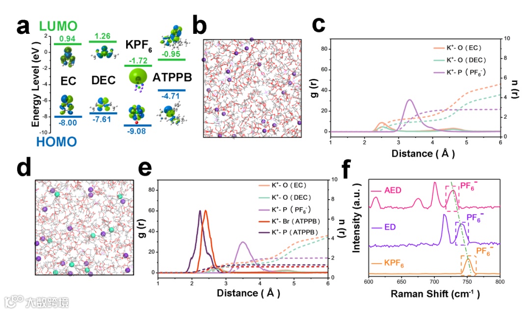 图3. a) 用密度泛函理论计算溶剂的分子轨道能。b)ED和d)AED电解质的MD模拟箱的快照。c)ED和e)AED电解质的K+-溶剂化结构的径向分布函数(g(r),实线)和n(r)(虚线)。f)不同体系中P-F键的拉曼光谱。