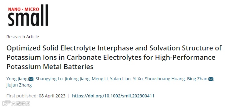 基于此,上海大学蒋永研究员、赵兵研究员与张久俊教授(加拿大皇家科学院院士)课题组,在国际知名期刊Small上发表题为“Optimized Solid Electrolyte Interphase and Solvation Structure of Potassium Ions in Carbonate Electrolytes for High-Performance Potassium Metal Batteries”的研究工作。