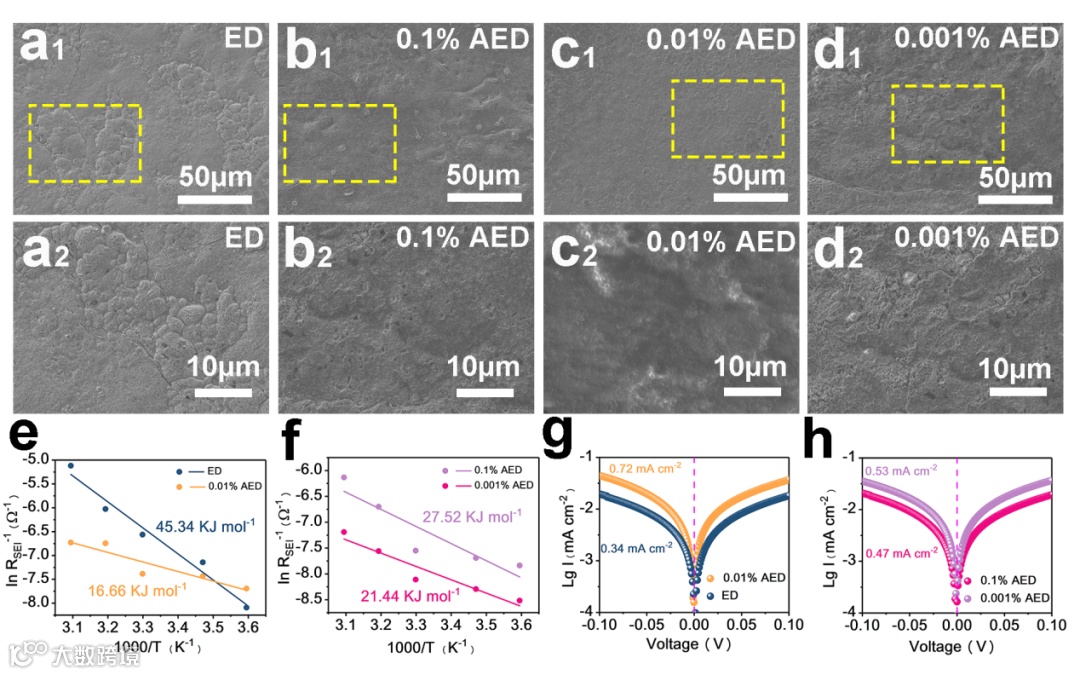 图2. 在0.5 mA cm-2,0.5 mAh cm-2下a)ED、b)0.1% AED、c)0.01% AED和 d)0.001% AED循环10次后镀K的SEM照片。e)ED和0.01% AED以及f)0.1% AED和0.001% AED中,K+通过SEI层扩散的Ea。g)ED和0.01% AED、h)0.1% AED和0.001% AED中的Tafel极化曲线。。