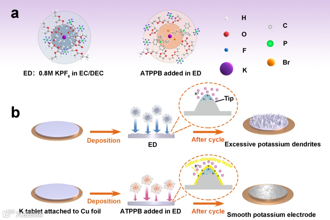 图1. 戊基三苯基溴化膦(ATPPB)添加剂用于稳定钾金属电池的效果示意图。(a)常用ED和添加ATPPB的ED(AED)电解质中的两种不同的溶剂化结构;(b)电池配置中ATPPB对枝晶生长的抑制。