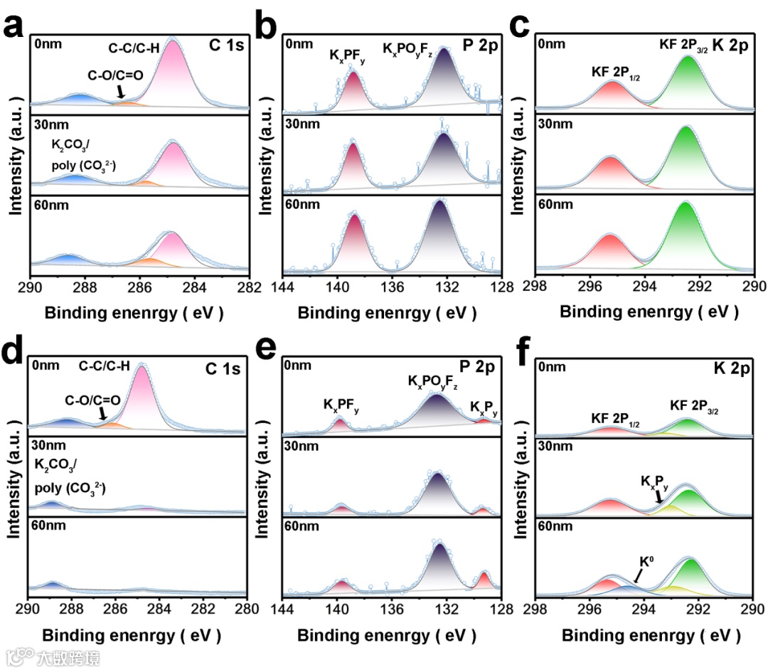 图4. 深度SEI表征。在a–c)ED和d–f)0.01% AED中10次循环后,K||K电池在不同溅射时间下的C 1s、P 2p和K 2p的XPS光谱。