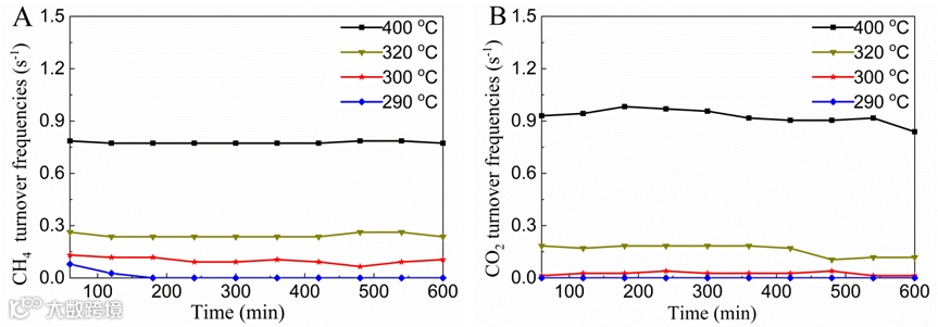 图 2 不同温度下Ni/ZrO2催化剂的转换频率CH4 (A)和CO2 (B)。