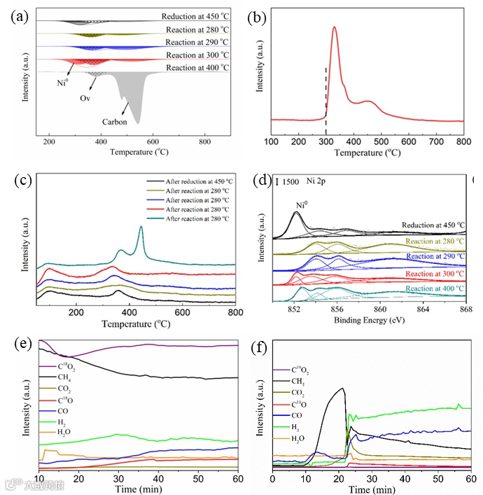 图3 不同反应温度下的Ni/ZrO2的CO2-TPO(a)、O-TPD(b)、原位XPS的Ni 2p(c)和Ni/ZrO2催化剂的H2-TPR结果;(e)C18O2重整甲烷反应实验结果;(f) C18O2重整甲烷反应实验后,CO2重整甲烷的结果。