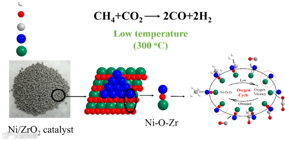 图1. 二氧化碳重整甲烷中Ni-O-Zr界面上Ni0与氧空位协同作用示意图。