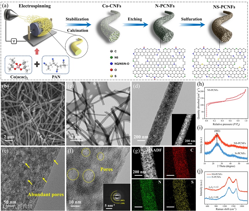 图1. (a)NS-PCNFs的合成过程示意图。NS-PCNFs的(b)SEM图、(c-e)TEM图,(f)HRTEM图以及(g)HAADF和C、N、S的元素分布图。(h) NS-PCNFs的氮气吸脱附等温曲线。N-PCNFs和NS-PCNFs的(i)XRD谱图和(j)拉曼光谱图。