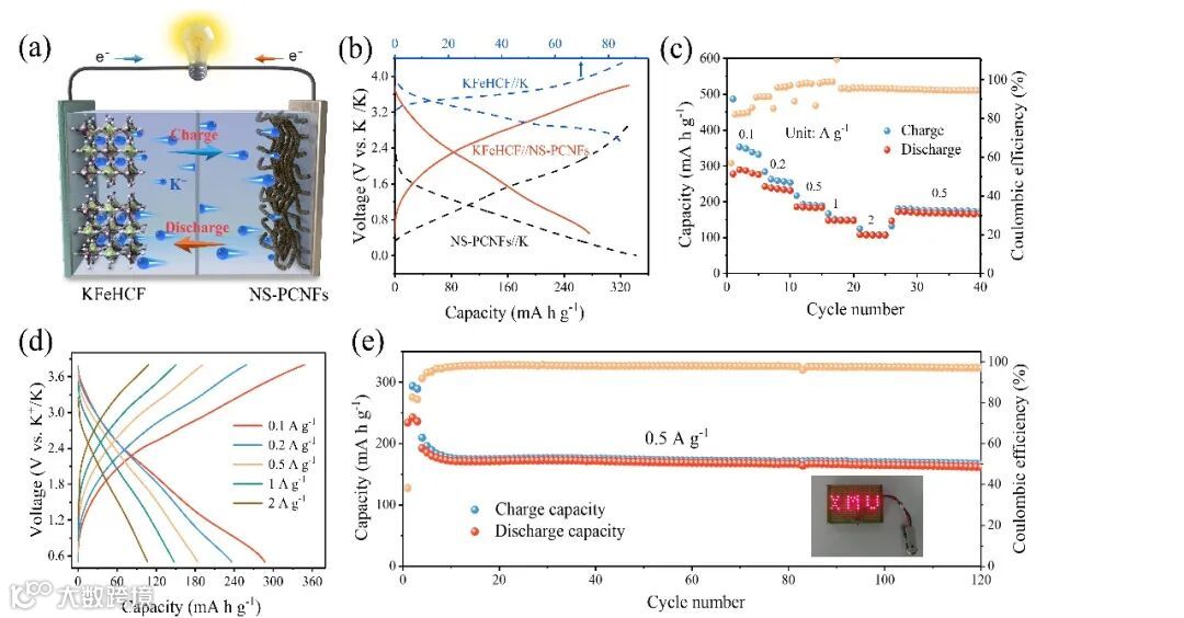 图4.(a)KFeHCF//NS-PCNFs全电池示意图。(b)0.1 A g-1下半电池和全电池的充放电曲线。(c)全电池的倍率性能和(d)对应的充放电曲线。(e)全电池在0.5 A g-1下的循环性能,插图为全电池点亮带有XMU标识的LED灯。