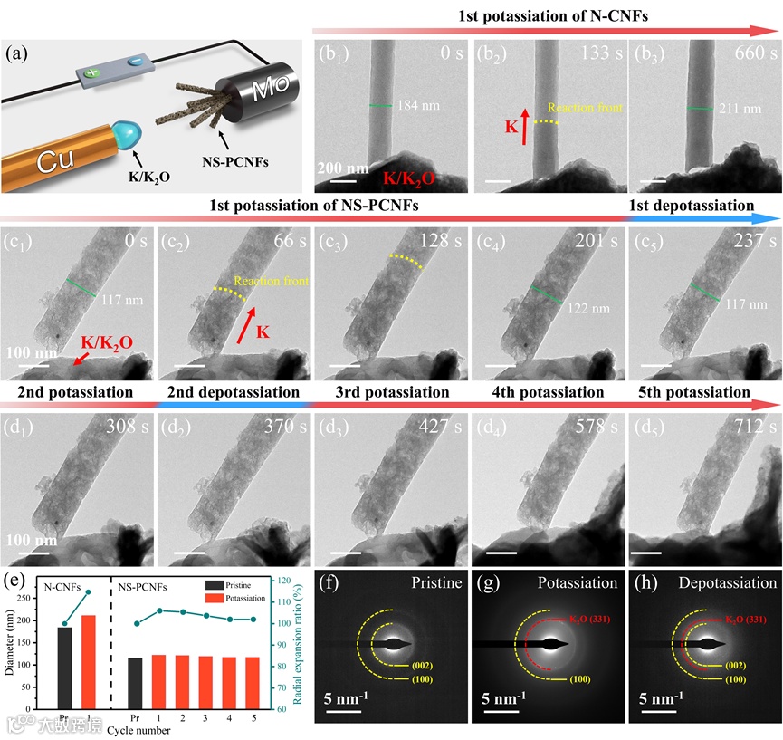 图5.(a)原位纳米电池装置示意图。(b)N-CNFs和(c-d)NS-PCNFs在嵌/脱钾循环时不同时刻的TEM图。(e)N-CNFs和NS-PCNFs在钾化后的直径变化图。(f-h)NS-PCNFs在原始状态、首次钾化,和脱钾后的SAED图。