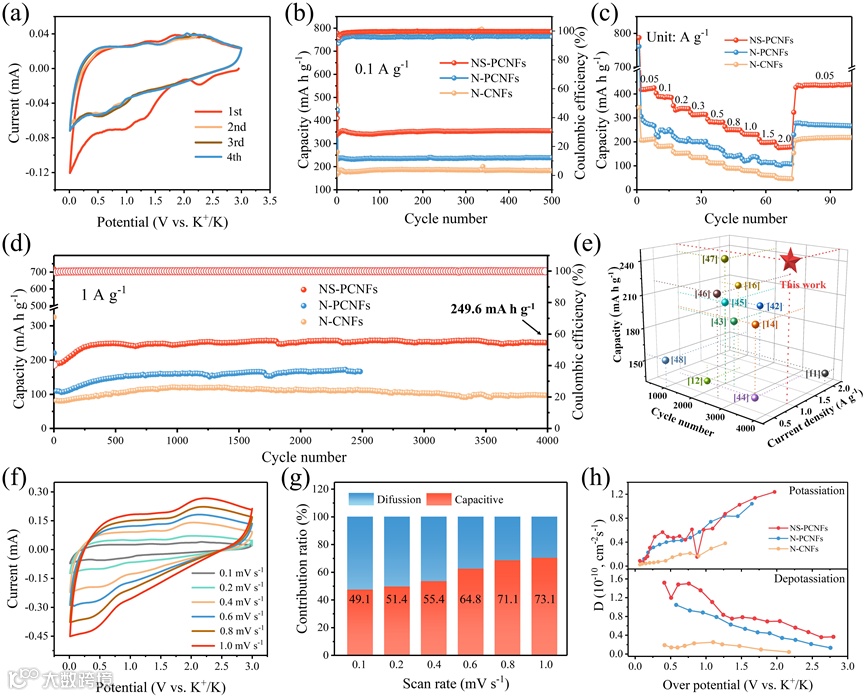 图3. (a)NS-PCNFs电极在0.1 mV s-1扫速下的CV曲线。3种电极的(b)0.1 A g-1下的循环性能,(c)倍率性能和(d)大电流密度下的循环性能。(e)NS-PCNFs与已报道的硬碳负极的循环性能对比图。NS-PCNFs电极在不同扫描速率下的(f)CV曲线和(g)电容贡献比例图。(h) NS-PCNFs电极在嵌/脱钾时的离子扩散系数。