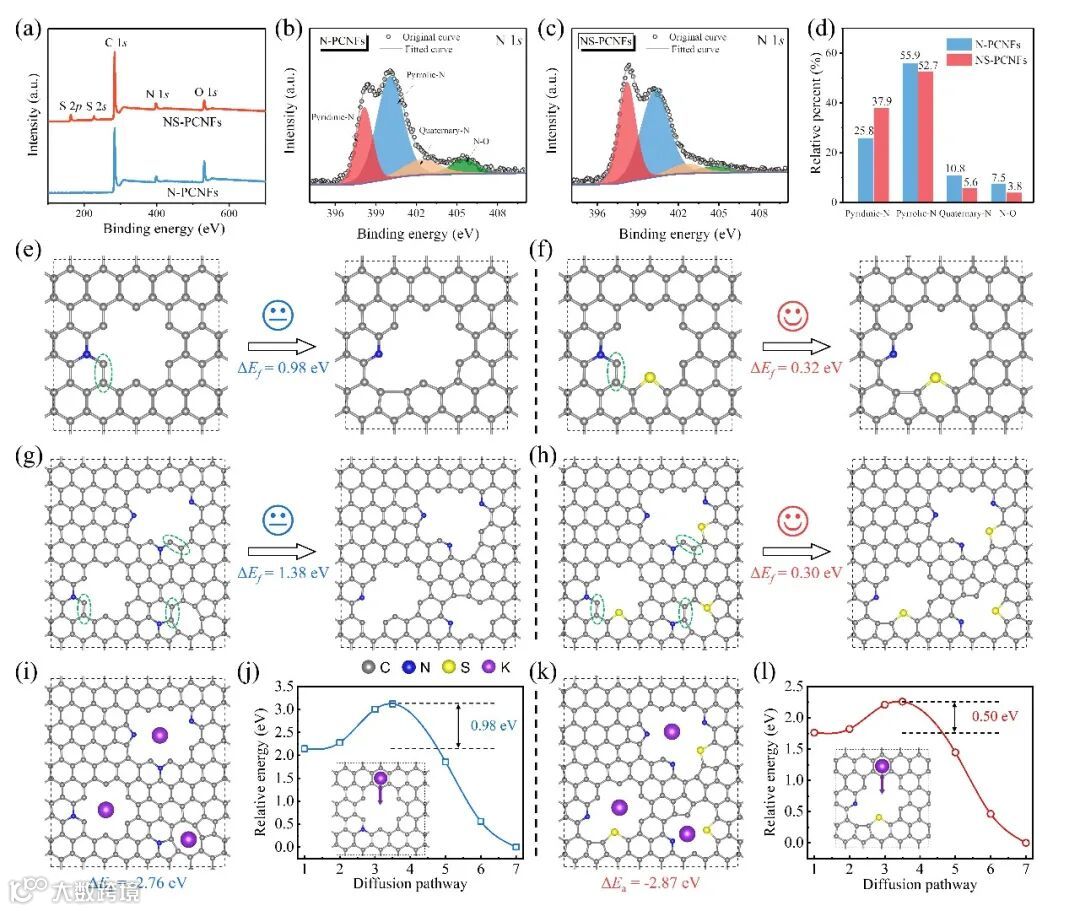 图2. (a)N-PCNFs和NS-PCNFs的XPS谱图。(b)N-PCNFs和(c)NS-PCNFs的N 1s高分辨XPS谱图。(f)2种材料中不同的N掺杂类型含量对比。(e)无S和(f)S掺杂后边缘石墨化-N转化为吡啶-N的形成能。(g)无S和(h)S掺杂后N掺杂多孔碳中多个石墨化-N转化为吡啶-N的形成能。K原子吸附在(i)N掺杂和(k)吡啶-N/S共掺杂多孔碳的优化模型和对应的吸附能。K在(j)N掺杂和(l)吡啶-N/S共掺杂多孔碳中的迁移能垒。