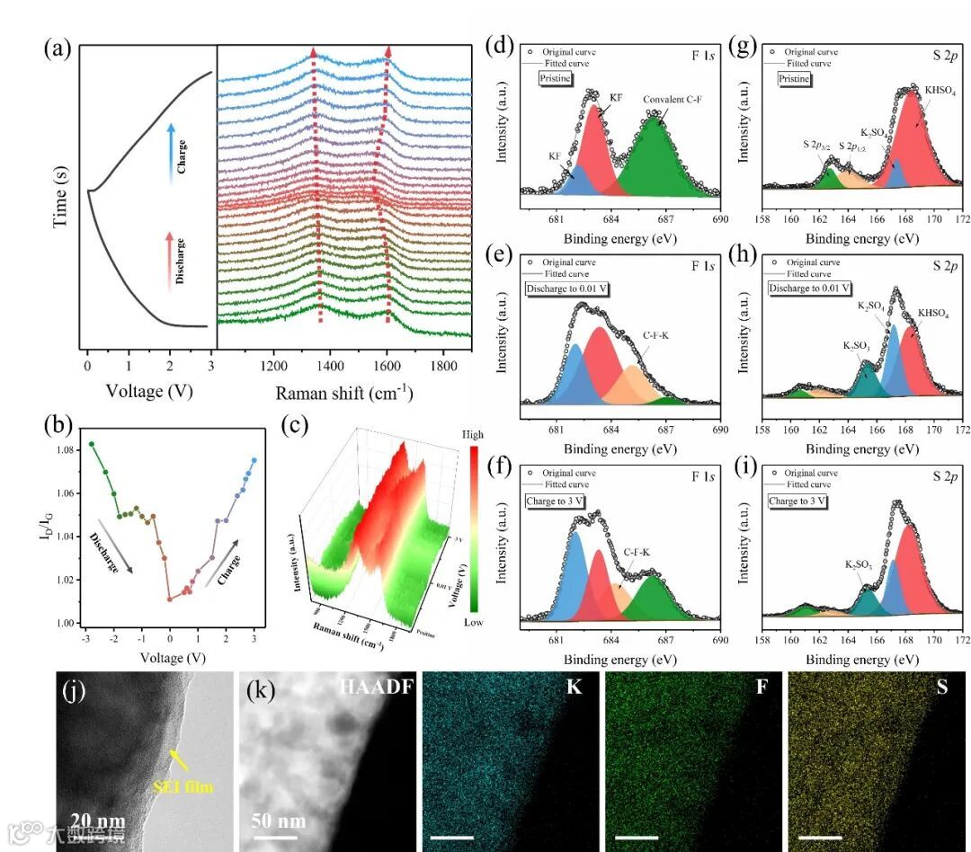 图5.(a)NS-PCNFs电极在首次充/放电循环时对应的原位拉曼光谱图,(b)对应的ID/IG值变化,和(c)三维颜色映射图。NS-PCNFs电极在不同电位下的(d-f)F 1s和(g-i)S 2p高分辨XPS光谱图。放电至0.01 V后NS-PCNFs的(j)TEM以及(k)HAADF和K、F、S的元素分布图。