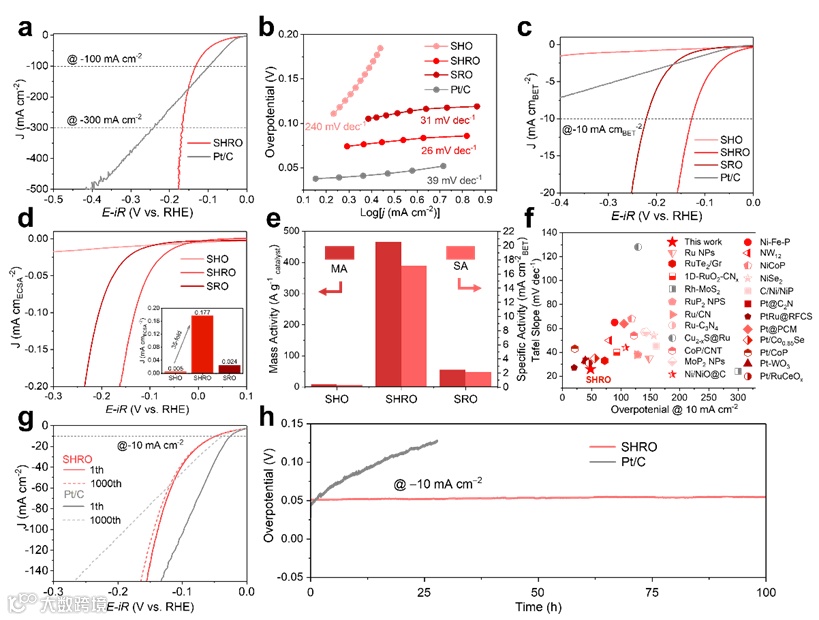 图2. 在酸性介质中电催化剂的HER 性能。a) SHRO和Pt/C在大电流密度区域的LSV曲线。b) SHO、SHRO、SRO 和基准 Pt/C 催化剂的塔菲尔图。c) 所有样品和 Pt/C 的 RSA 作为施加电势的函数。d) SHO、SHRO 和 SRO 催化剂的内在活性标准化为 ECSA。e)质量活性和内在活性。f) 金属化合物之间的酸性 HER 活性比较。g)催化剂在1000次加速耐久性测试的极化曲线。h) SHRO 在恒定阴极电流密度下的计时电位响应。