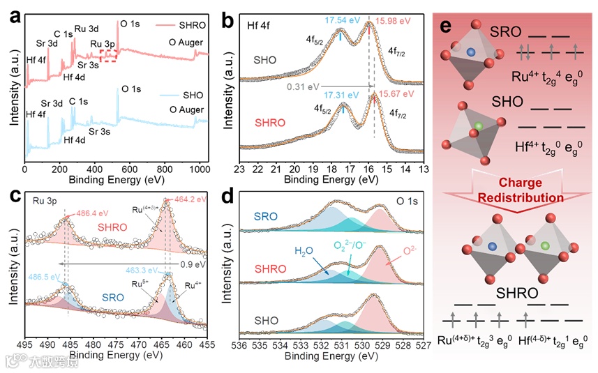 图 3. SHRO 的电子结构变化和电荷重新分布。a) SHRO 和 SHO 的XPS总能谱。b) SHO 和 SHRO 的 Hf 4f能谱图。c) SHRO 和 SRO 的 Ru 3p能谱图。d) SHO、SHRO 和 SRO 的 O 1s 能谱图。