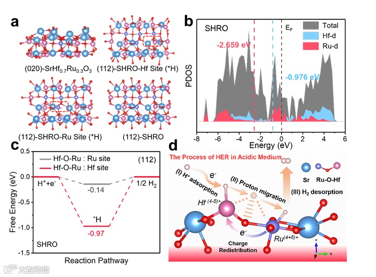 图 4.DFT 计算。a)SHRO的(020)和 (112) 晶面结构。b) SHRO 的 PDOS总能谱图。c) SHRO上酸性 HER 中H+吸附步骤的 Hf 和 Ru 位点的吉布斯自由能图。d)SHRO钙钛矿氧化物上原子级双金属氢迁移的酸性HER催化机理示意图。