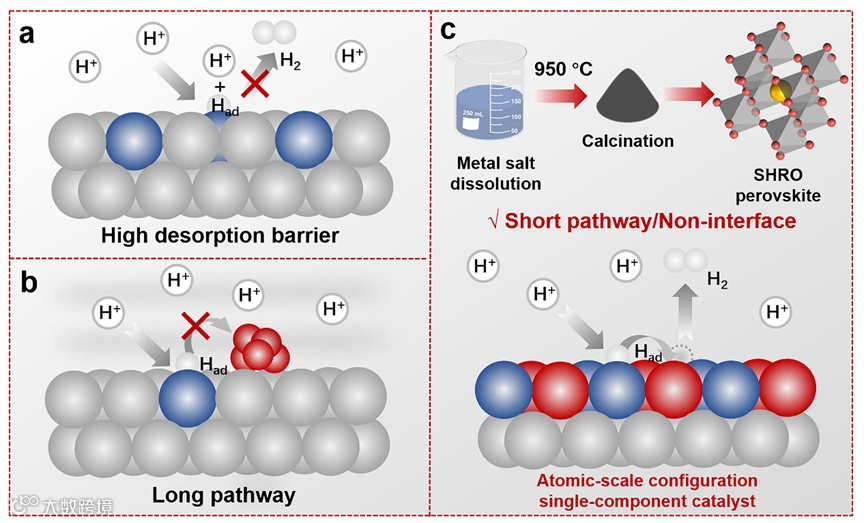 在反应路径中实现有利的H*吸附和H2解吸对于增强酸性HER动力学至关重要。然而,目前具有该特性的异质结构催化剂存在高界面传输势垒的问题。考虑到单相组分催化剂的短距离反应路径和无界面特性,具有原子尺度构型的钙钛矿氧化物中的多种离子和可变结构能够提供独特的电子和导电特性,调节反应中间体的结合能和电子传输行为。通过原子级调节金属活性位点的功函数,最大限度地减少界面/非界面电荷积累,有效降低质子转移势垒,从而有效的促进酸性HER过程中靶向步骤的协同催化。
