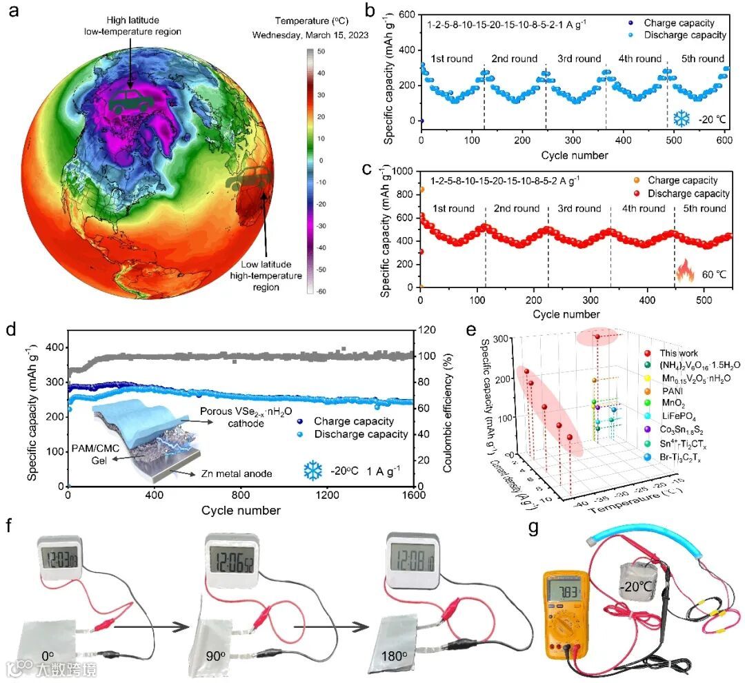 图6. 多孔VSe2-x·nH2O正极材料在水/固锌离子电池中的宽温性能测试(a) 2023年3月15日全球气温分布。图片来自美国缅因大学气候变化研究所气候再分析仪。水电池在(b) -20℃和(c) 60℃温度环境下的倍率性能测试。(d)固体电池在1 A g-1和-20℃条件下的循环性能测试。(e)与以往报告在低温性能方面的比较。在(f)室温和(g)零下温度环境下应用的柔性可折叠固态锌电池的演示。