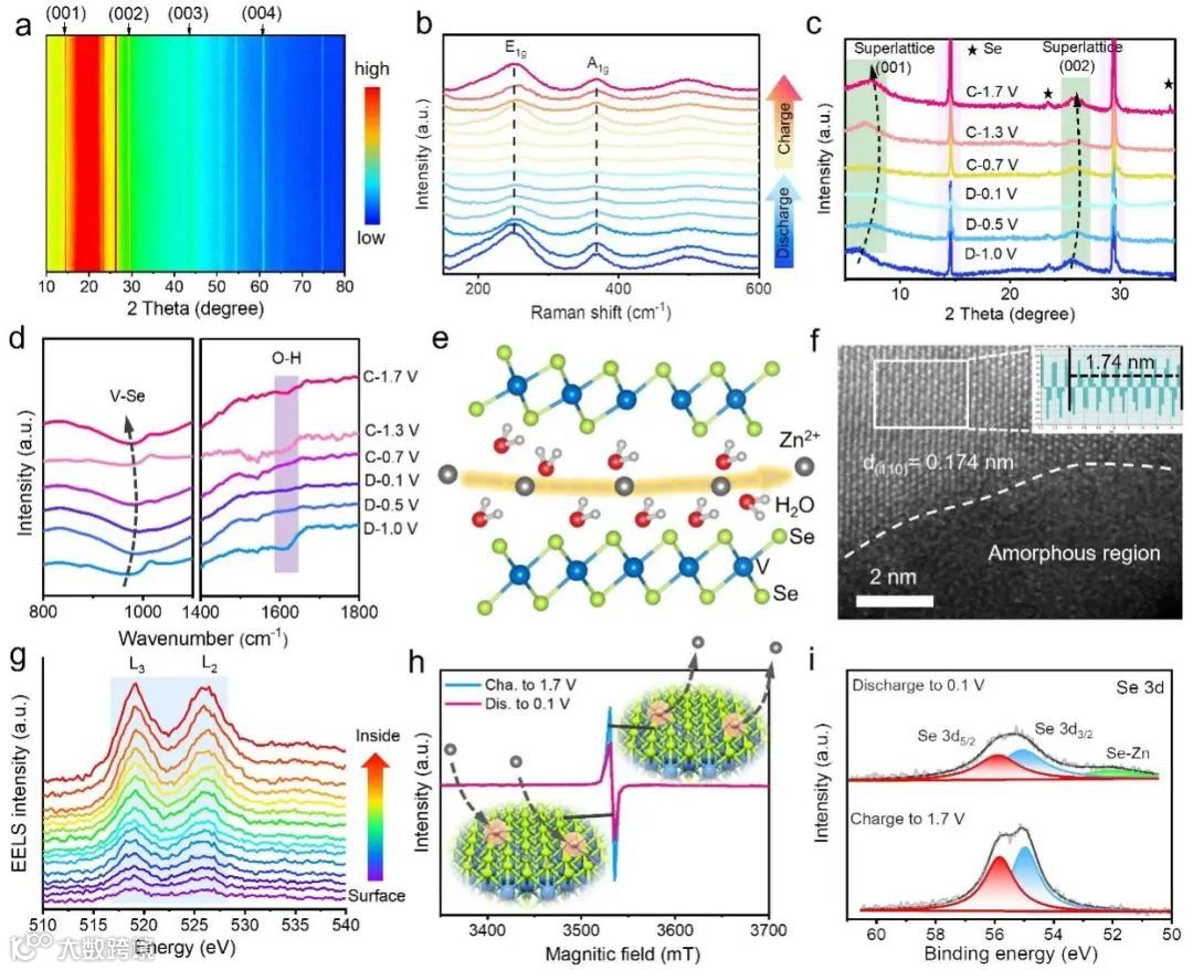 图3. 系统研究了多孔VSe2-x·nH2O正极的存储机理。(a)第一次循环的原位XRD图。(b)第一个周期的原位拉曼光谱。(c)第21循环的非原位XRD图谱。(d)第21个周期的非原位FTIR光谱,(e)相应的机理图。(f)电极完全放电状态下的STEM图像和(g)相应的EELS光谱。(h)电极在不同状态下的原位EPR光谱和(i) Se 3d XPS光谱。