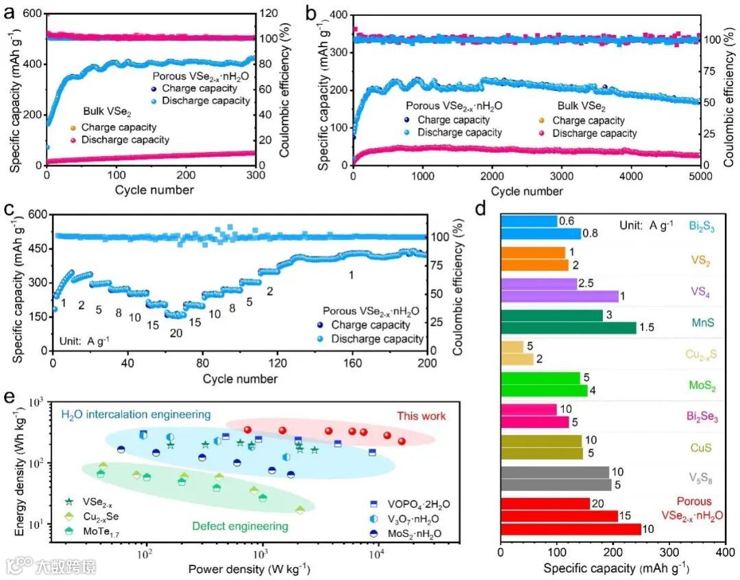 图2. 块体VSe2和多孔VSe2-x·nH2O正极材料的电化学性能测试。(a) 1 A g-1和(b) 10 A g-1电流密度下的循环稳定性测试。(c)多孔VSe2-x·nH2O正极倍率性能测试。(d)与其他基于TMDs的正极材料在高倍率性能方面的比较。(e)关于本工作的功率密度与能量密度的Ragone图和目前层状和缺陷正极材料比较的状态。