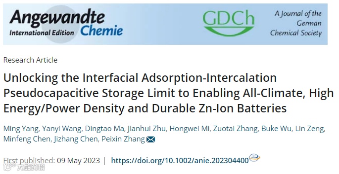 近日,深圳大学张培新、马定涛团队在国际知名期刊AngewandteChemie上发表题目为“Unlocking the Interfacial Adsorption-Intercalation Pseudocapacitive Storage Limit to Enabling All-Climate, High Energy/Power Density and Durable Zn-Ion Batteries”的研究论文。