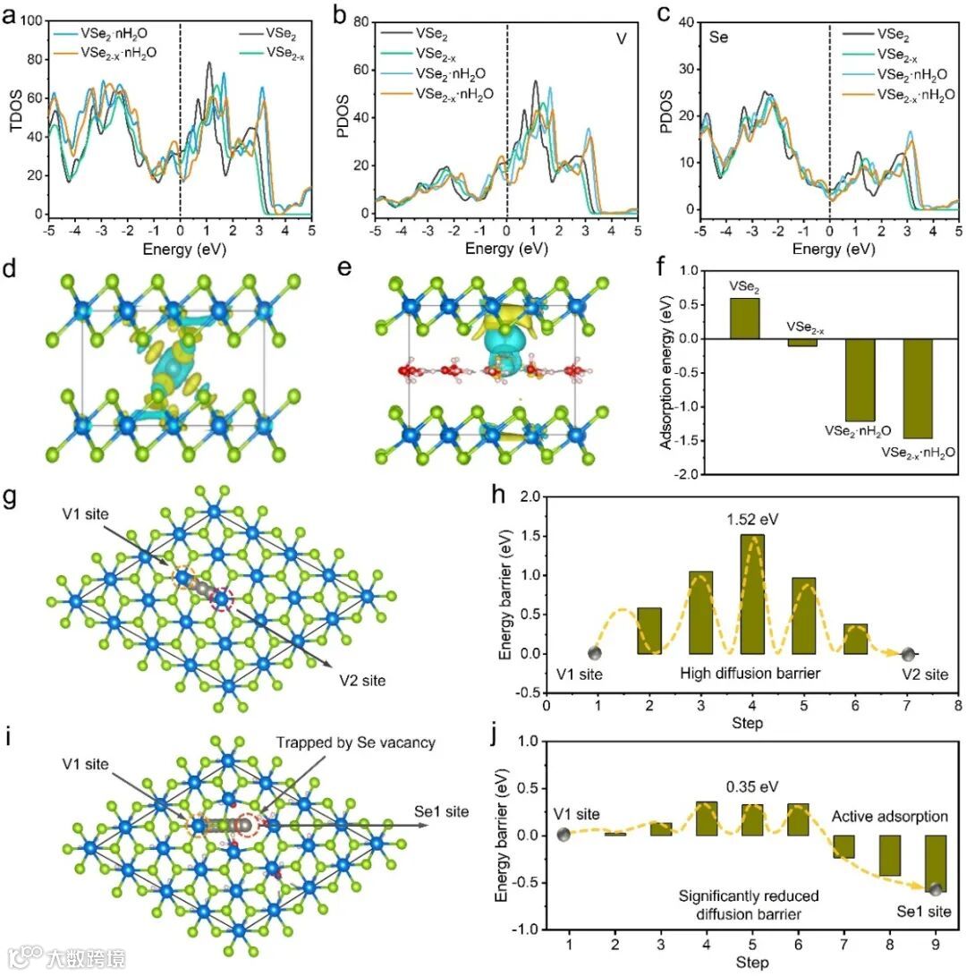 图5.Zn原子与VSe2、VSe2-x、VSe2·nH2O和VSe2-x·nH2O相互作用的理论研究。(a)不同锌插层结构的TDOS与(b) V PDOS和(c) Se PDOS的比较。(d) Zn-VSe2和(e) Zn-VSe2-x·nH2O的侧视图晶体结构和电荷密度差,(f)它们对应的吸附能。Zn在(g, h) VSe2和(i, j) VSe2-x·nH2O中分别沿最小能量路径和相应的能垒扩散。
