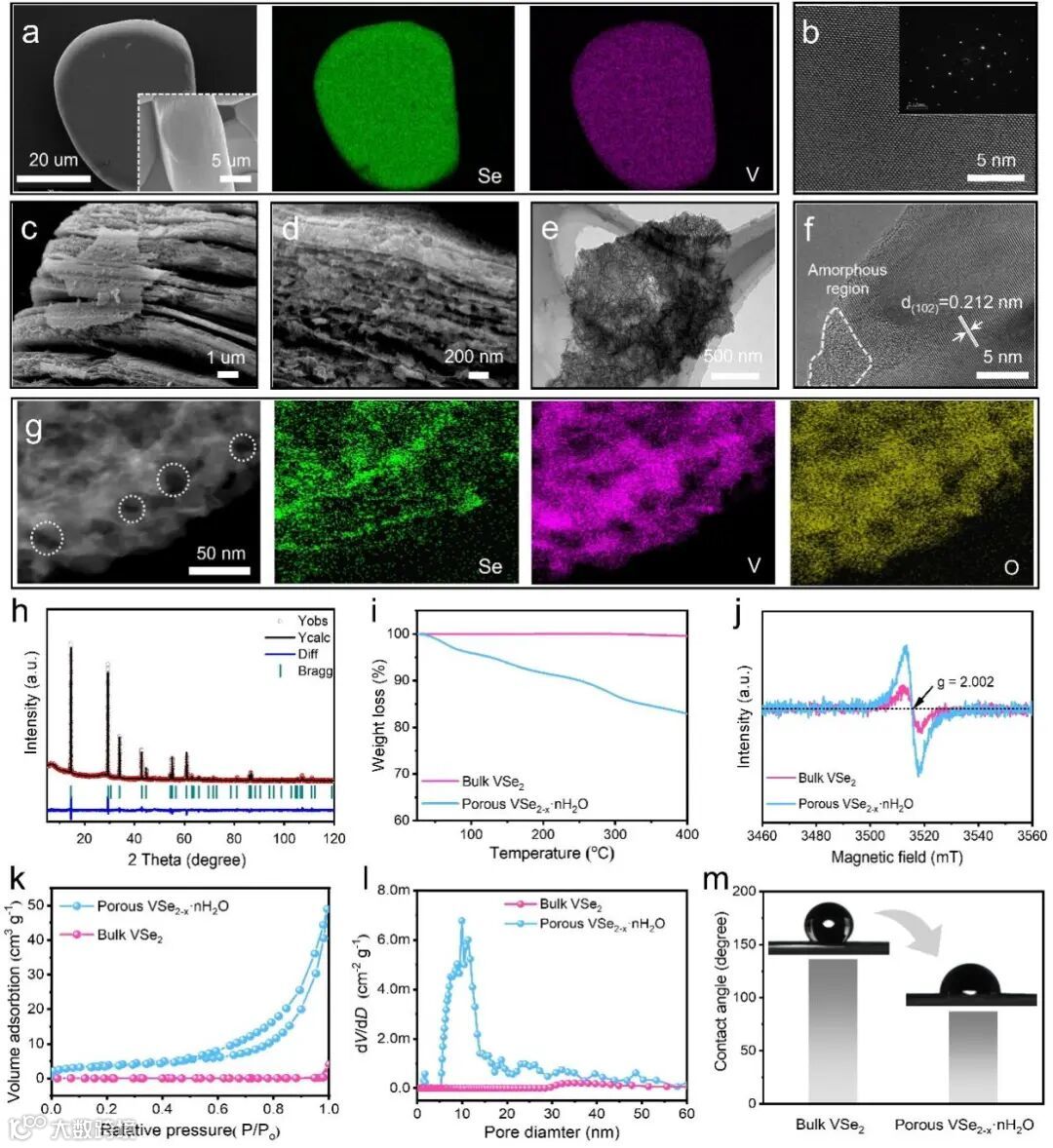 图1. 块体VSe2和多孔VSe2-x·nH2O的形貌和结构表征。(a) FESEM图像和相应的(Se和V)元素分布;(b)块体VSe2的HRTEM图像。(c, d)多孔VSe2-x·nH2O的FESEM图像,(e) TEM图像和(f) HRTEM图像,(g)对应的(Se, V, O)元素分布。(h)多孔VSe2-x·nH2O的XRD精修。(i) TG测试、(j) EPR测试、(k)氮气吸附/解吸试验和(l)对应孔径分布及(m)接触角测试的比较。