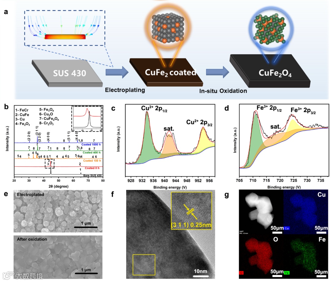 图2| CuFe2O4尖晶石涂层的制备和表征。(a) 原位形成的CuFe2O4尖晶石涂层的示意图。(b) 镀有CuFe2合金的SUS430样品在不同热处理下的XRD图谱。CuFe2O4涂层在800°C下氧化400小时后的(c)Cu2p和(d)Fe2p的XPS光谱。(e) 电镀和氧化后CuFe2涂层的表面形貌。(f) CuFe2O4涂层的HR-TEM图像和(g)EDS图谱。