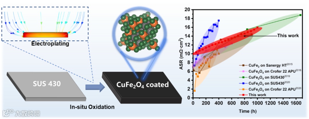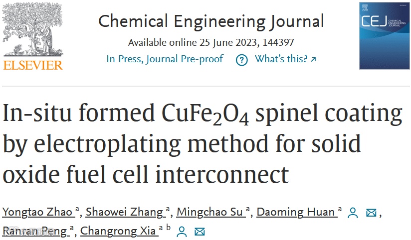 近日,来自中国科学技术大学的夏长荣教授研究团队在《Chemical Engineering Journal》期刊上发表题为“In-situ formed CuFe2O4 spinel coating by electroplating method for solid oxide fuel cell interconnect”的研究论文。该工作提出了一种在不锈钢连接体表面电镀CuFe2合金涂层,并原位氧化形成CuFe2O4涂层的思路。在该涂层保护下,不锈钢连接体的电阻增长趋势得到了抑制。同时,不锈钢连接体中的Cr挥发对于LSCF阴极的中毒损害现象也显著降低。