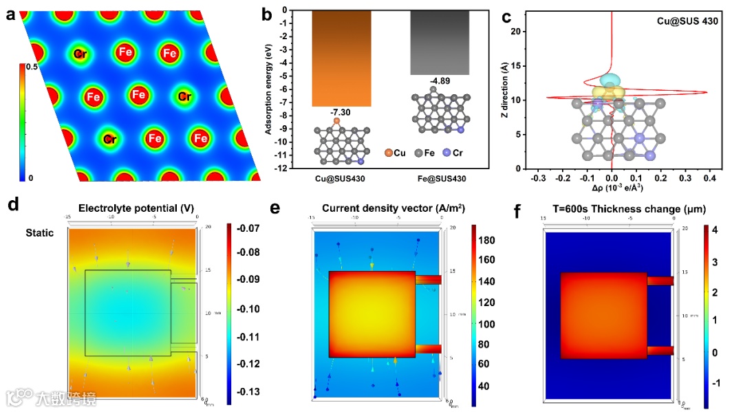 图1| 电镀CuFe2合金的理论机理分析。(a) SUS430(110)平面上的表面电荷密度分布。(b) Cu和Fe原子在SUS430(110)表面上的吸附能。(c) 电荷密度差和一维平面平均电荷密度(黄色和青色代表电荷累积耗尽)。(d) 当整个系统达到稳定状态时,电镀系统中的电势分布。(e) 镀件(SUS430)表面上的局部电流效率。(f) 电镀600秒后总镀层厚度的模拟预测。