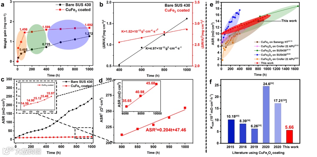 (d)基于ASR增长对10000h(空气中800℃)的长期行为的预测。(e)已报道工作中CuFe2O4涂层保护下不锈钢样品ASR长期测试结果(f)涂层SUS 430在800°C下氧化10000小时的预测寿命。