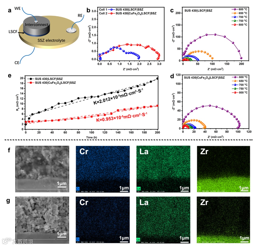 使用三电极测试法,将涂层保护下的SUS 430作为LSCF阴极的集流体,对该构型的电池进行了200h(空气中800℃)的长期测试。结果显示,在涂层保护下,与连接体直接接触的阴极阻抗增长得到了明显的抑制(图5e)。结合测试完成后LSCF阴极的微观形貌和元素分布(图5f & g),进一步证明了本研究中的CuFe2O4尖晶石有效的保护了阴极不受Cr中毒的影响。