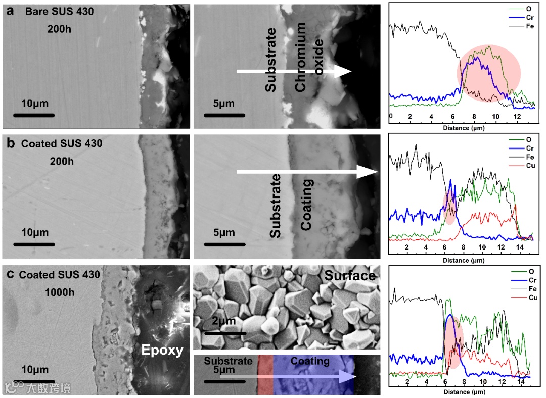 图4 | 微观形貌与元素分布结果。(a) 无涂层和(b)有涂层保护下的SUS 430在200h(空气中800℃)后的截面形貌与元素分布。(c)氧化1000小时后涂层保护下SUS 430的表面、截面形貌与元素分布。