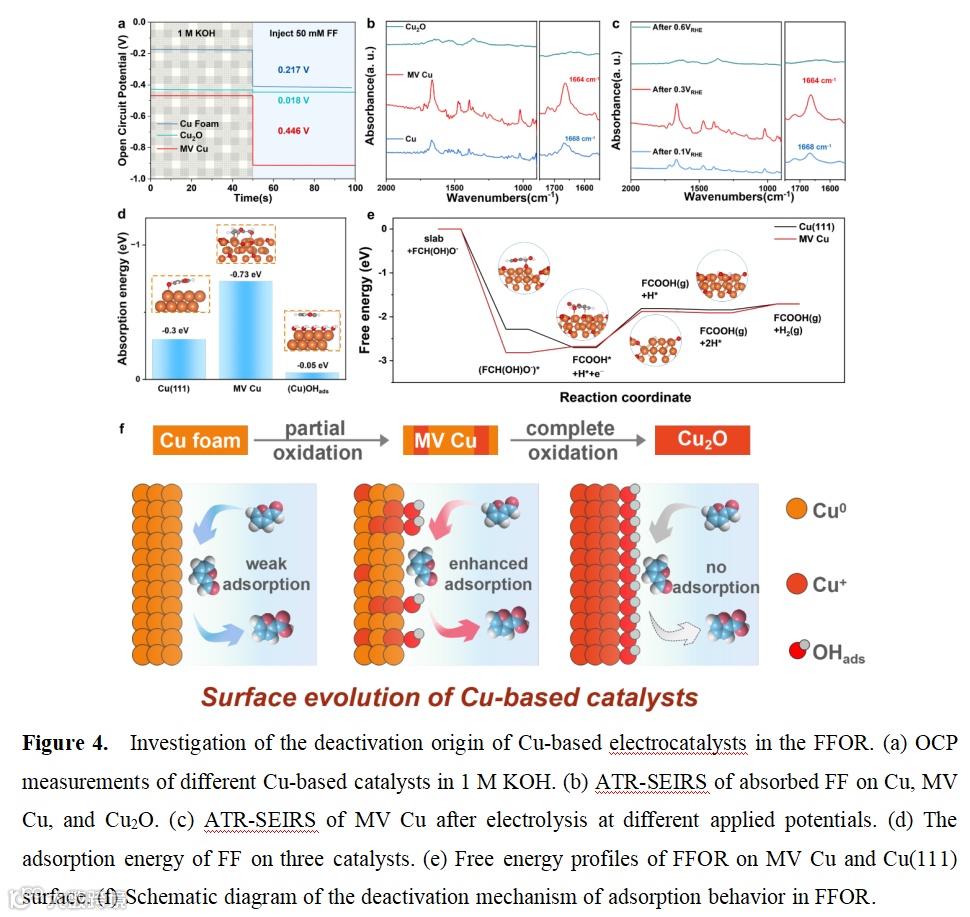要点二:结合电化学数据对比,原位同步辐射监控反应过程中价态变化,原位红外跟踪吸附行为的变化,并辅助以DFT计算相应的吸附能,揭示了铜基催化剂的失活机理。即由于铜价态在反应过程中的变化导致的糠醛催化剂吸附行为的变化。