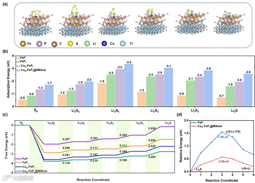 图5. (a)优化后的CoD-FePv@MXene在多硫化物吸附结构; (b)多硫化物在FeP、FePv、CoD-FePv和CoD-FePv@MXene表面吸附能, (c)吉布斯自由能; (d) Li2S分解势垒的计算数值。