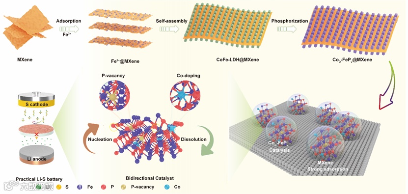 图1. CoD-FePv@MXene催化剂的制备过程及其对Li2S成核和溶解的作用示意图