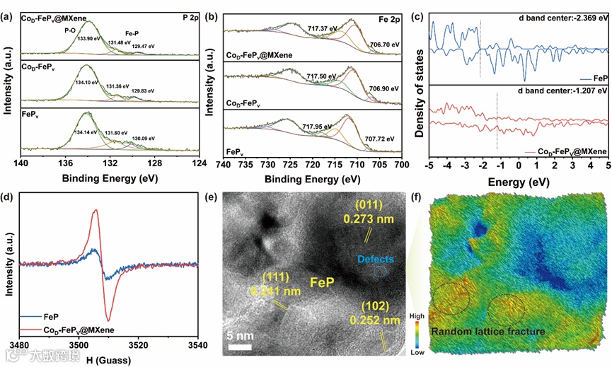 图2. (a-b) P 2p、Fe 2p的XPS谱图。(c) CoD-FePv@MXene和FeP的DOS图; (d) EPR谱图; (e) HRTEM图像和(f)对应的三维彩色曲面图。