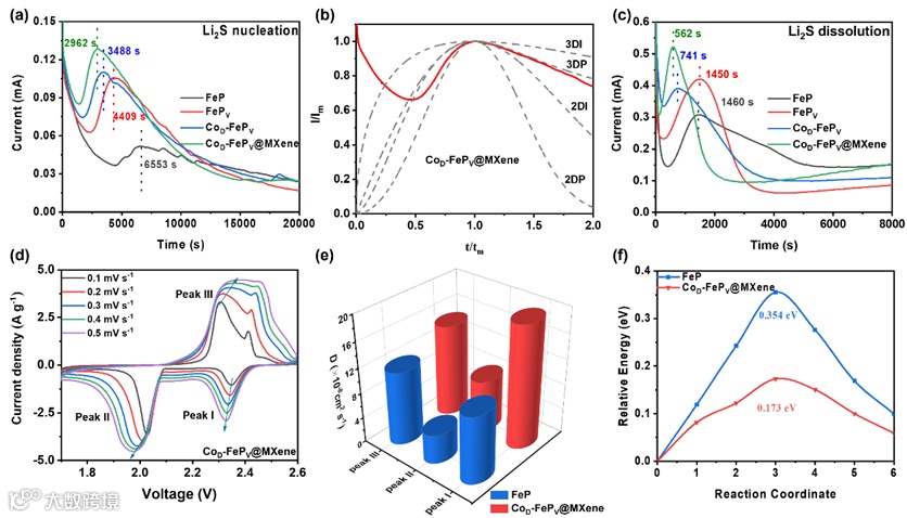 图3. (a) 恒电位放电曲线; (b) Li2S成核过程的无因次电流-时间瞬态; (c)恒电位电荷分布图。(d) CV曲线; (e) DLi+值; (f) 锂离子迁移过程的相对能垒计算数值。